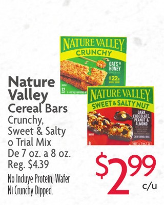 Nature valley cereal bars crunchy, sweet y salty o trial mix de 7 oz. a 8 oz.