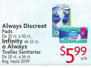 Always discreet pads de 20 ct. a 30 ct., infinity de 32 ct. o always toallas sanitarias de 20 ct. a 36 ct.