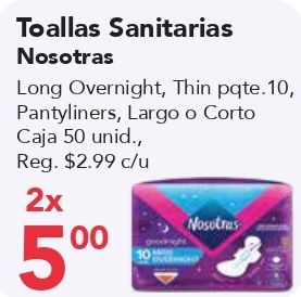 toallas sanitarias long overnight thin pqte pantyliners, corto caja unid., reg. $c/u