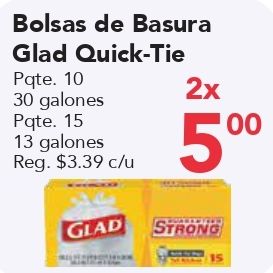 bolsas basura glad quick-tie pqte alones pqte. reg. $c/u strong