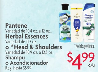 Pantene Variedad de 10.4 oz. a 12 oz., Herbal Essences Variedad de 11.7 oz. o *Head & Shoulders Variedad de 10.9 oz. a 12.5 oz. Shampu o Acondicionador
