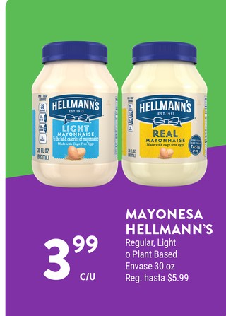 Mayonesa hellmann´s regular, light o plant based envase 30 oz
