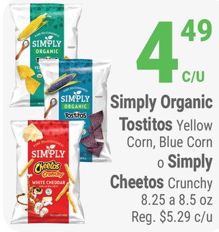 Simply Organic Tostitos Yellow Corn, Blue Corn o Simply Cheetos Crunchy 8.25 a 8.5 oz