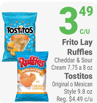 Frito Lay Ruffles Cheddar & Sour Cream 7.75 a 8 oz Tostitos Original o Mexican Style 9.8 oz