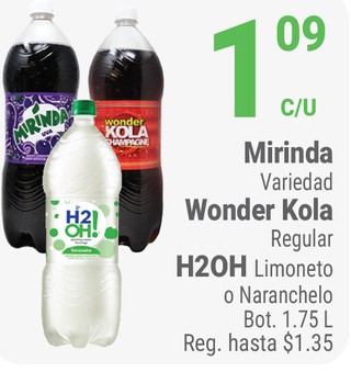 Mirinda Variedad Wonder Kola Regular H2OH Limoneto o Naranchelo Bot. 1.75 L