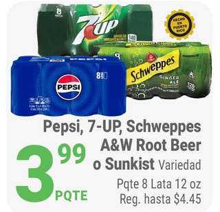 Pepsi, 7-UP, Schweppes A&W Root Beer o Sunkist Variedad Pqte 8 Lata 12 oz