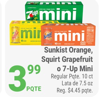 Sunkist Orange, Squirt Grapefruit o 7-Up Mini Regular Pqte. 10 ct Lata de 7.5 oz