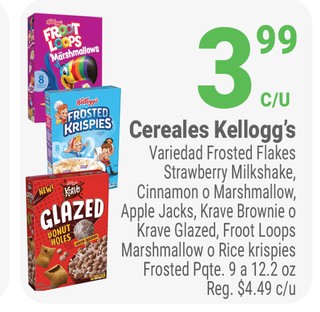Cereales Kellogg's Variedad Frosted Flakes Strawberry Milkshake, Cinnamon o Marshmallow, Apple Jacks, Krave Brownie o Krave Glazed, Froot Loops Marshmallow.