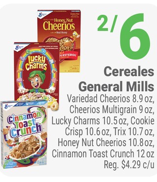 Cereales General Mills Variedad Cheerios 8.9 oz, Cheerios Multigrain 9 oz, Lucky Charms 10.5 oz, Cookie Crisp 10.6 oz, Trix 10.7 oz, Honey Nut Cheerios 10.8oz.