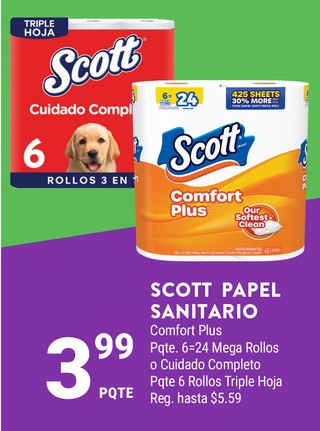 Scott papel sanitario comfort plus pqte. 6=24 mega rollos o cuidados completo pqte 6 rollos triple hoja