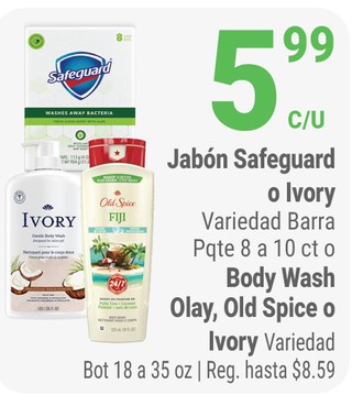 Jabon safeguard o ivory variedad barra pqte 8 a 10 ct o body wash olay, old spice o ivory variedad bot 18 a 35 oz