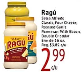 ragu ragĂș salsa alfredo classic four cheese roasted garlic parmesan, with bacon, double cheddar env. reg. $c/u