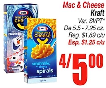 kraft macargo frozen macaroni& chееse cheese svpt* reg. $c/u smmmile cheesy spirals esp.
