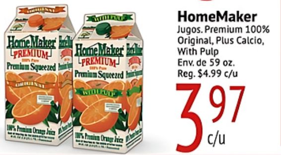 home maker premium squeezed istol futs homemaker jugos original plus calcio, with pulp env. reg. $c/u zin% prmin orange juic juice