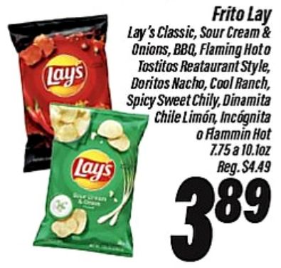 frito lay's lays classic sour cream onions, bbq, flaming hoto tostitos reataurant style, doritos nacho, cool ranch, spicy sweet chily, dinamita chile limón, incógnita flammin