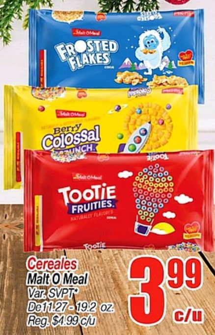 omeal frosted flakes berry colossal crunch tootie fruities naturally flavored cereales malt meal svpt reg. $c/u