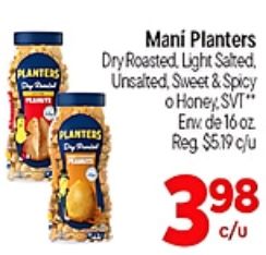 planters mani roasted light salted unsalted, sweet spicy honey, svt" $c/u