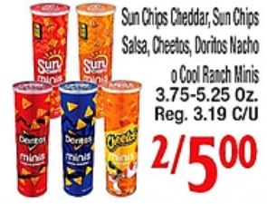 chips cheddar salsa, cheetos, doritos nacho cool ranch minis reg. dongos thinks