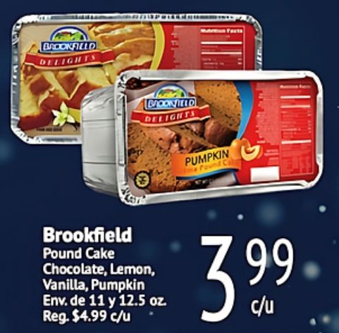 brookfield delights badon leed pumpkin pound cake chocolate lemon, vanilla, reg. $c/u