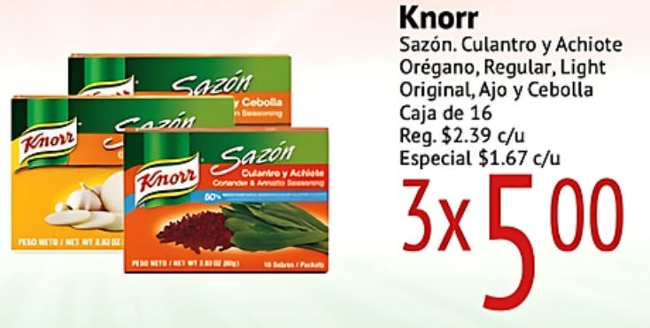 sazón cebolla knorr culantro achiote neto/met orégano regular, light original, caja reg. $c/u especial