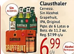 alcohol clausthaler cerveza grapefruit ipa, original pate. latas bots. reg. $c/u ramoved
