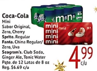 coca-cola mini sabor original zero, cherry sprite regular fanta. china regular/mini seagram's. club soda. ginger ale, tonic water pate. latas reg. $c/u