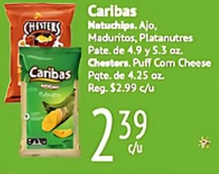 chesters caribas natuchips maduritos, platanutres pate. chesters. puff cheese reg. $c/u