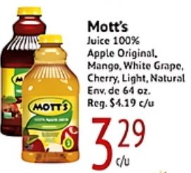 mott's juice apple original mango white grape, cherry, light, natural env. reg. $c/u