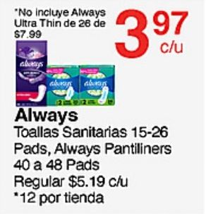 incluye always ultra thin $aboys toallas sanitarias pads pantiliners regular $c/u *por tienda