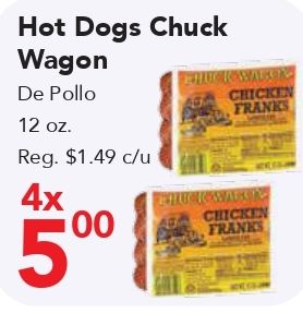 dogs chuck wagon pollo chicken franks reg. $c/u