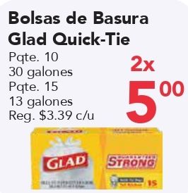 bolsas basura glad quick-tie pqte alones pqte. reg. $c/u strong