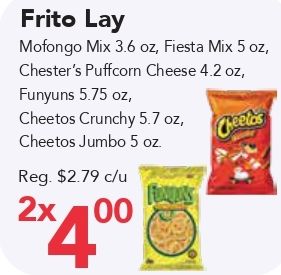 frito mofongo fiesta chester's puffcorn cheese funyuns cheetos crunchy jumbo reg. $c/u *.⁰⁰