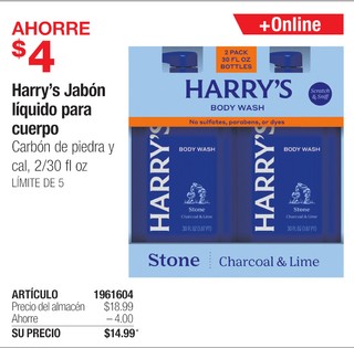 Harry's Jabón lÃquido para cuerpo Carbón de piedra y cal, 2/30 fl oz
