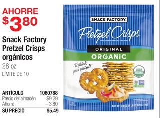 Snack Factory Pretzel Crisps orgánicos 28 oz LÃMITE DE 10