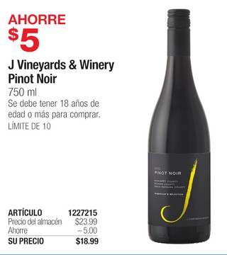 J Vineyards & Winery Pinot Noir 750 ml Se debe tener 18 años de edad o mas para comprar.