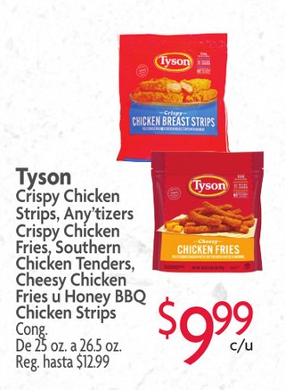 TYSON CRISPY CHICKEN STRIPS, ANY'TIZERS CRISPY CHICKEN FRIES, SOUTHERN CHECKEN TENDERS, CHEESY CHIKEN FRIES U HONEY BBQ CHECKEN STRIPS CONG. DE 25OZ A 26.5OZ