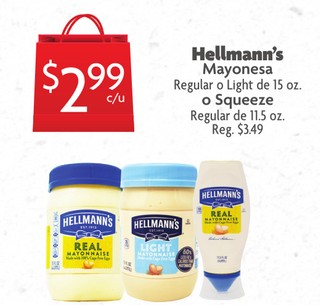 HELLMANN'S MAYONESA REGULAR O LIGHT DE 15OZ O SQUEEZE REGULAR DE 11.5OZ