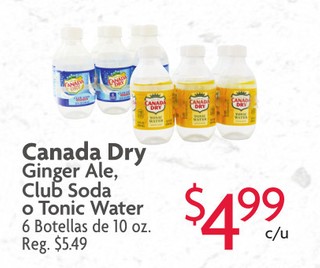 Canada Dry Ginger Ale, Club Soda o Tonic Water 6 Botellas de 10 oz.