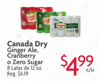 Canada Dry Ginger Ale, Cranberry o Zero Sugar 8 Latas de 12 oz.