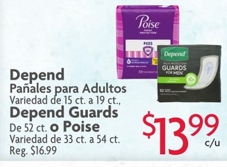 DEPEND PAÑALES PARA ADULTOS VARIEDAD DE 15 CT. A 19 CT. Depend Guards de 52 ct. o Poise variedad de 33 ct. a 54 ct