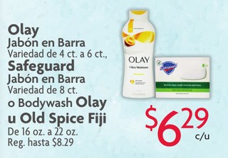 Olay Jabón en Barra variedad de 4 ct. a 6 ct. Safeguard Jabón en Barra variedad de 8 ct. o body wash Olay u Old Spice Fiji de 16 oz. a 22 oz