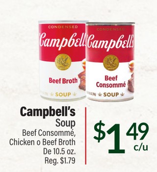 Campbell´s soup beef consomme, chicken o beef broth de 10.5 oz.