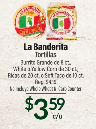 La Banderita Tortillas Burrito Grande de 8 ct., White o Yellow Corn de 30 ct., Ricas de 20 ct. o Soft Taco de 10 ct.