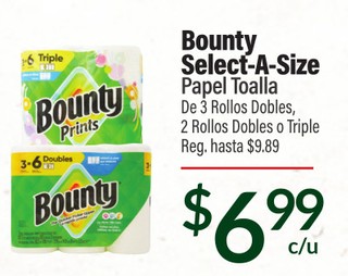 BOUNTY SELECT-A-SIZE PAPEL TOALLA DE 3 ROLLOS DOBLES 2 ROLLOS DOBLES O TRIPLE