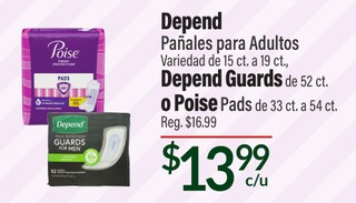 DEPEND PAÑALES PARA ADULTOS VARIEDAD DE 15 CT A 19 CT DEPENDE GUARDS DE 52 CT O POISE PADS DE 33 CT A 54 CT
