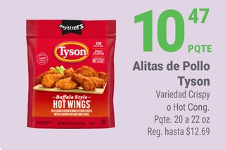 Alitas de Pollo Tyson Variedad Crispy o Hot Cong. Pqte. 20 a 22 oz.