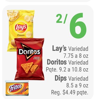 Lay's Variedad 7.75 a 8 oz Doritos Variedad Pqte. 9.2 a 10.8 oz Dips Variedad 8.5 a 9 oz