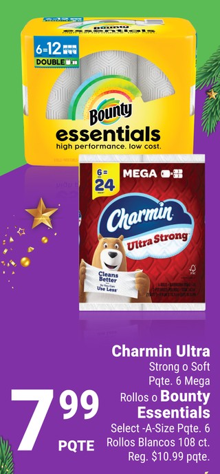 Charmin Ultra Strong o Soft Pqte. 6 Mega Rollos o Bounty Essentials Select -A-Size Pqte. 6 Rollos Blancos 108 ct.