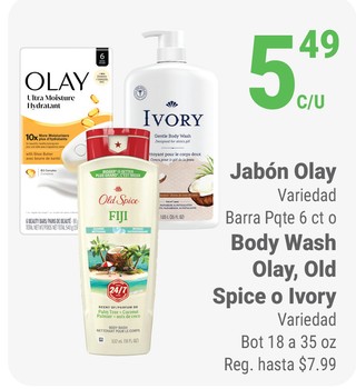 JABÓN OLAY VARIEDAD BARRA PQTE 6 CT. BODY WASH OLAY, OLD SPICE O IVORY VARIEDAD BOT. 18 A 35 OZ