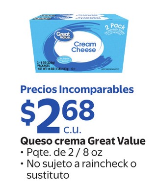Queso crema Great Value Pqte. de 2 / 8 oz.